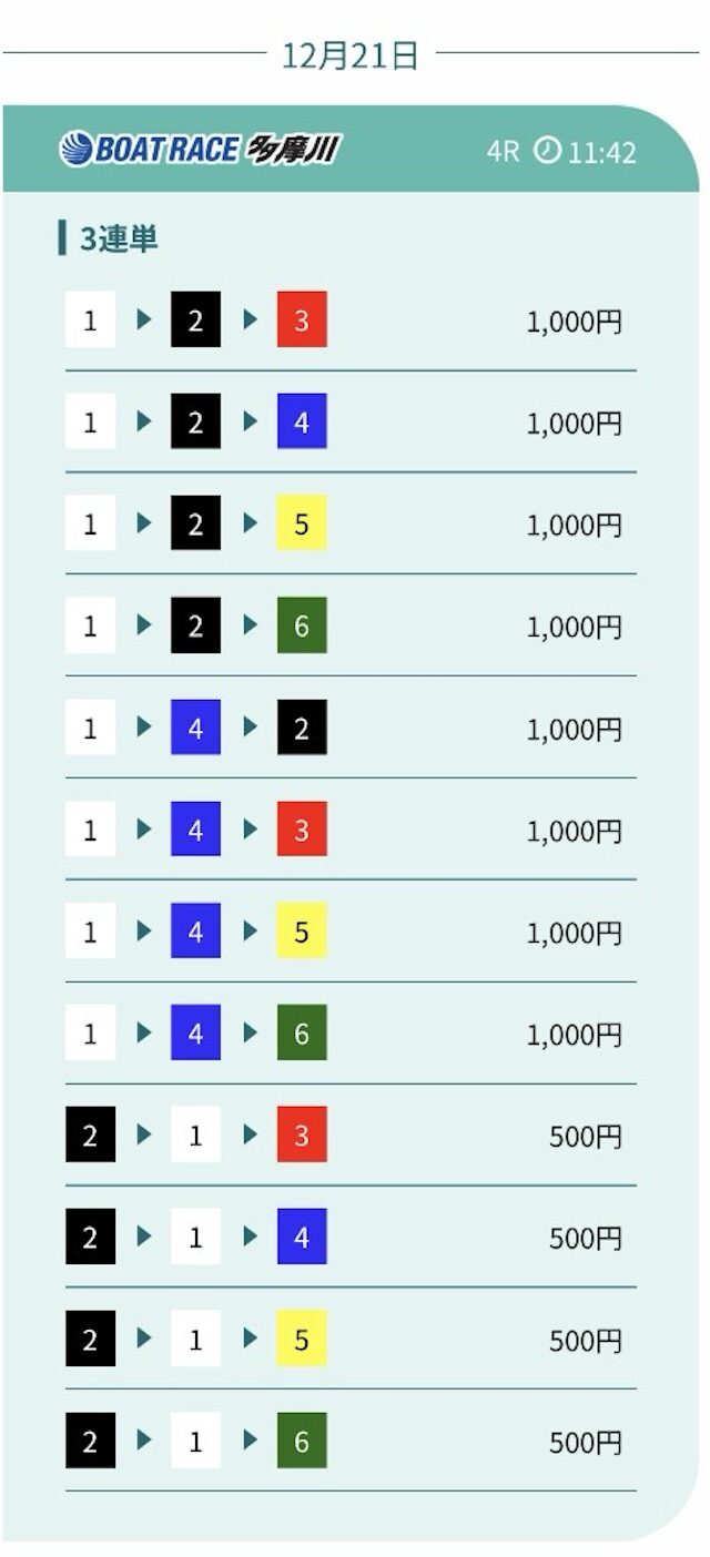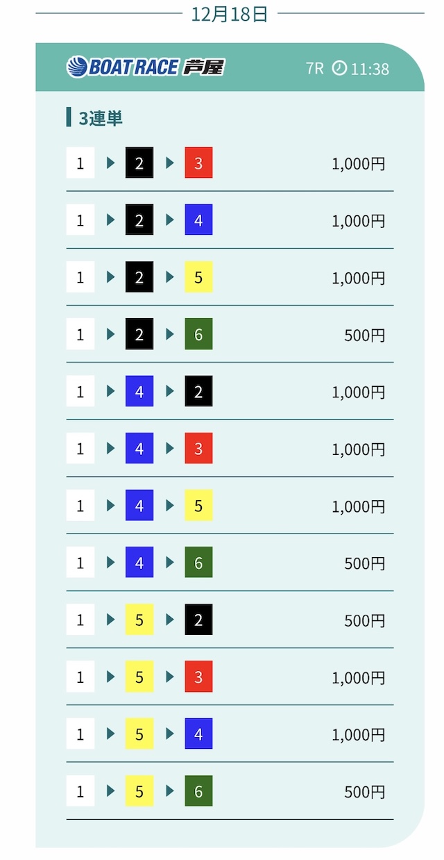 - 12月15日 大村7R【買い目】三連単1-2-36.1倍0円 - 10,000円= -10,000円✕