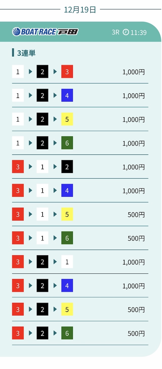 - 12月19日 戸田3R【買い目】三連単3-1-534.3倍17,150円 - 10,000円= 7,150円171.5%