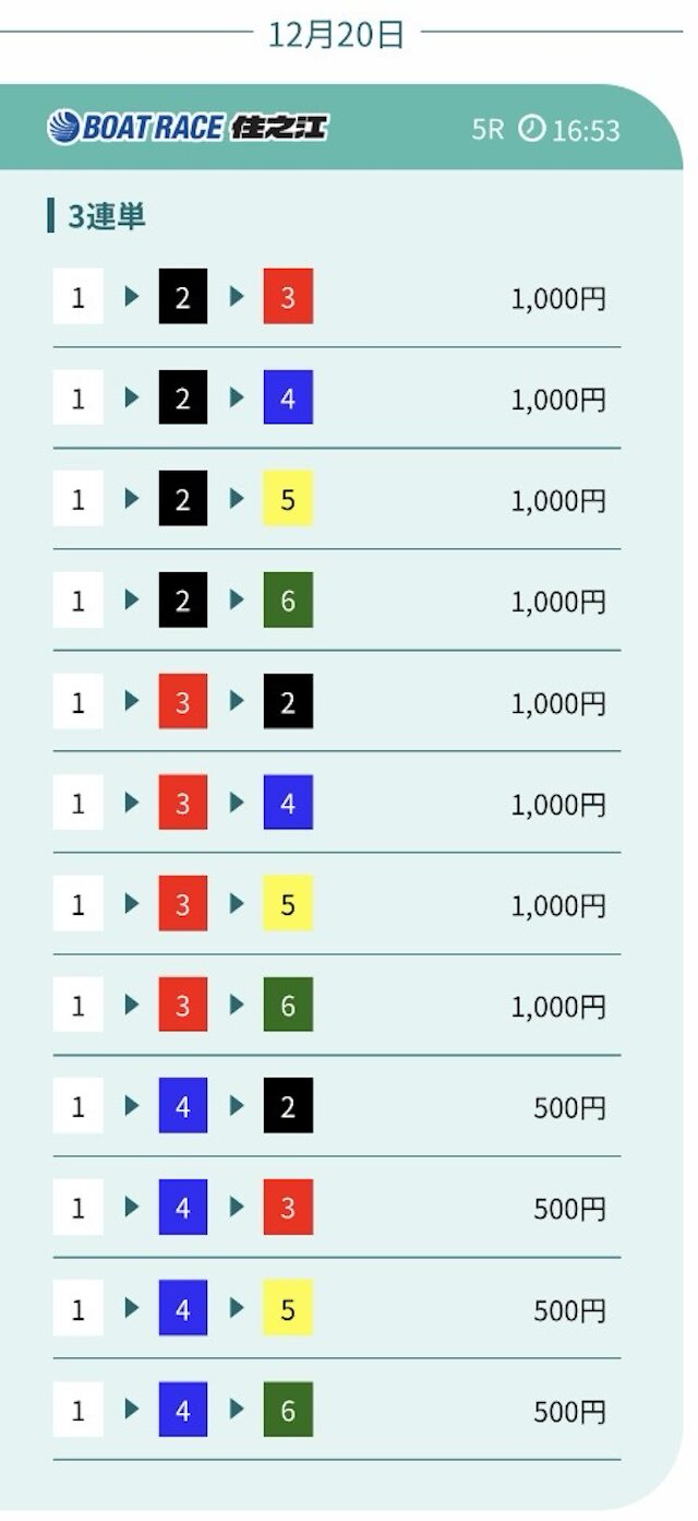 - 12月16日 住之江7R【買い目】三連単1-2-312.1倍0円 - 10,000円= -10,000円✕