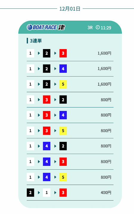 - 12/2 津6R三連単 9点1−4−3獲得金額36,480円投資金額9,200円22.8倍+27,280円