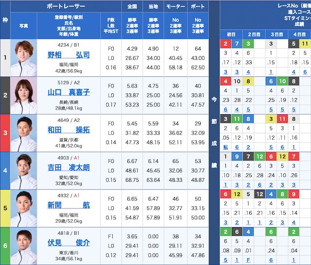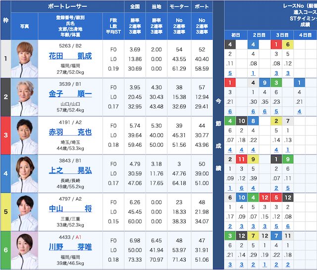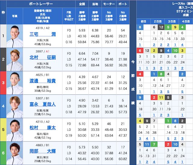 内枠3艇は不調気味な選手が多く、外枠の④・⑤艇は今節の成績が良く級別はA1。