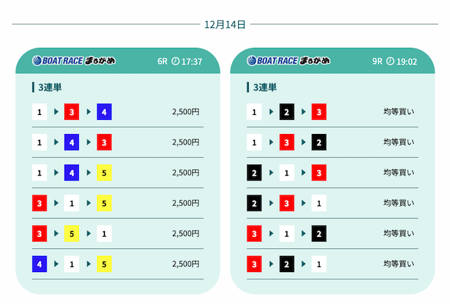 - 12/22 丸亀8R三連単 12点2−1−4獲得金額14,200円投資金額10,000円14.2倍+4,200円