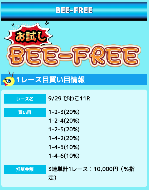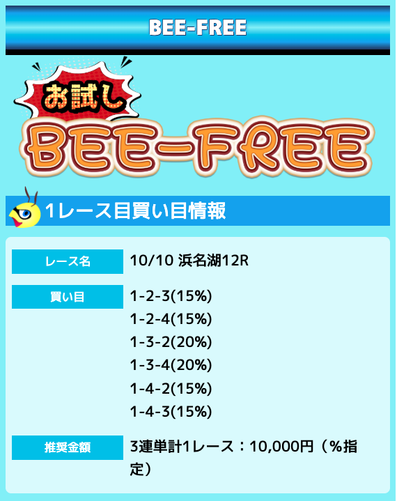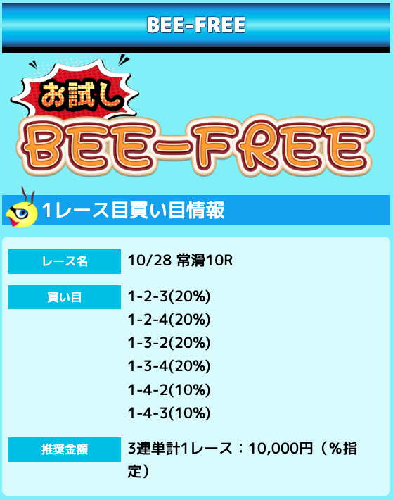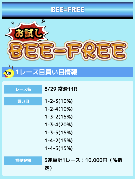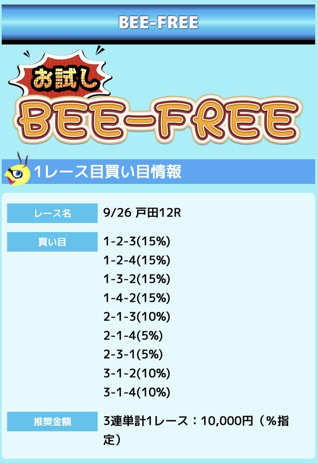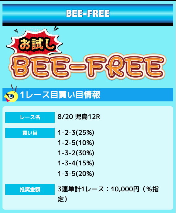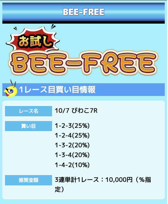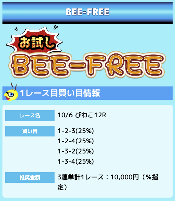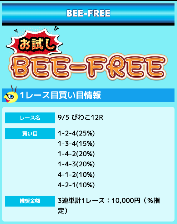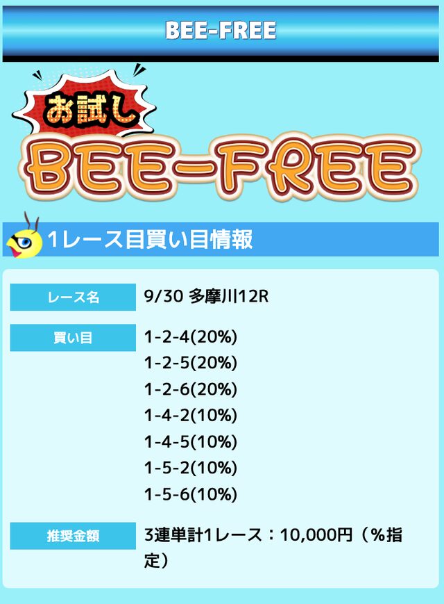 業界屈指の安さを誇るBEE-TRIALも良いですが、払戻金額は無料予想の良い時と同じくらいのレベル。