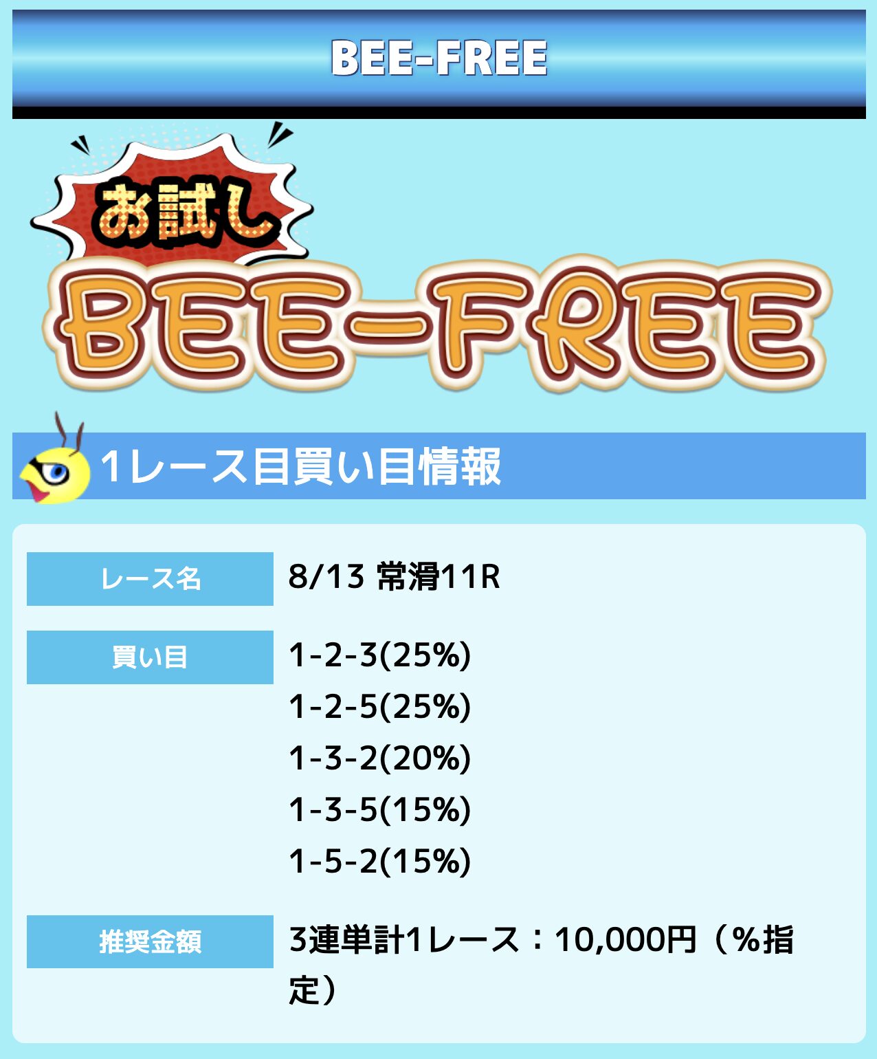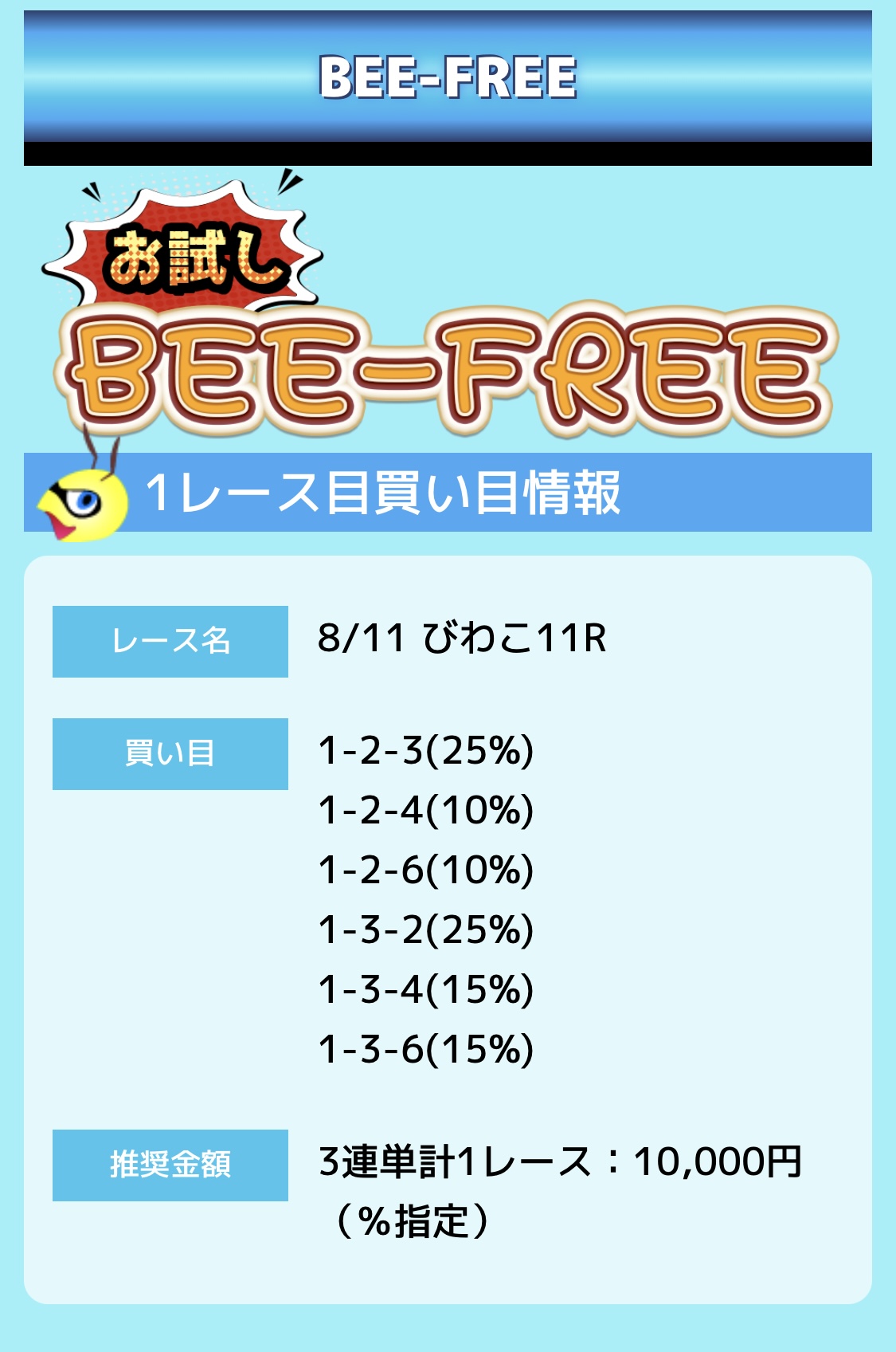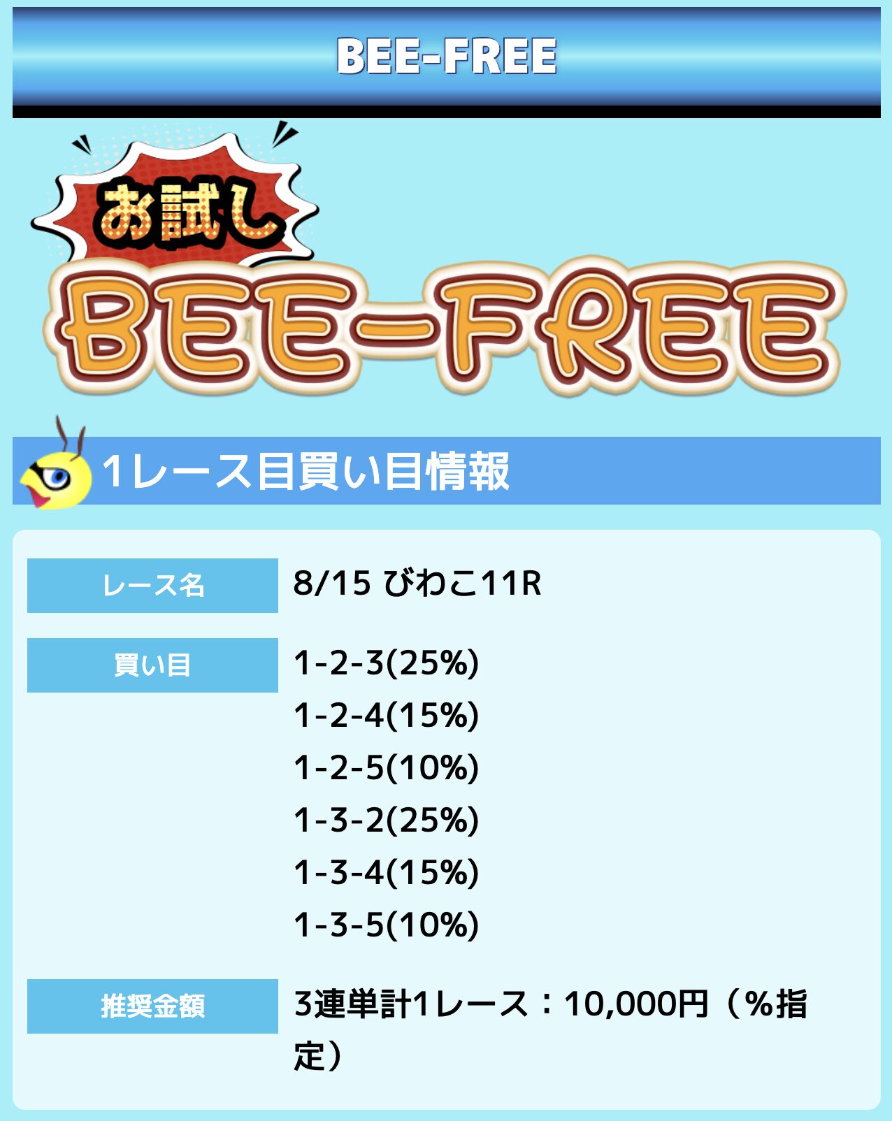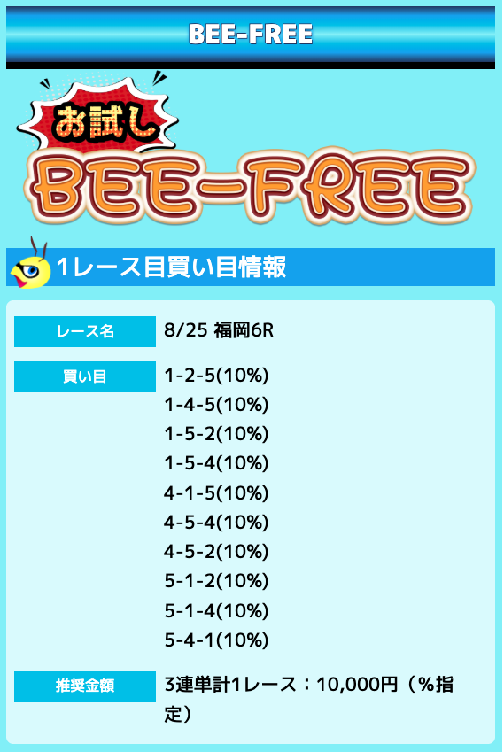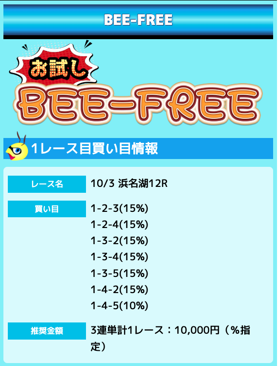 業界屈指の安さを誇るBEE-TRIALも良いですが、払戻金額は無料予想の良い時と同じくらいのレベル。