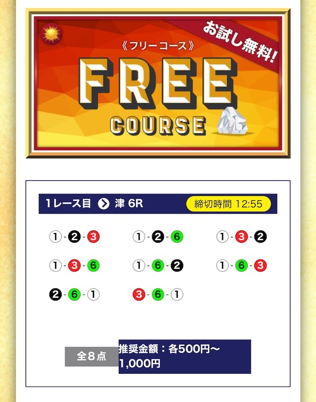 プラン料金は15万円と高いですが、1点2,000円(推奨)の6点の予想、合計12,000円が200万円に化けるなら買う価値は高いと判断するべきでしょう。