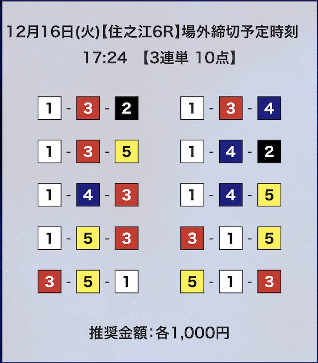 - 12月16日 住之江6R【買い目】三連単1-4-324.5倍24,500円 - 10,000円= 14,500円245%