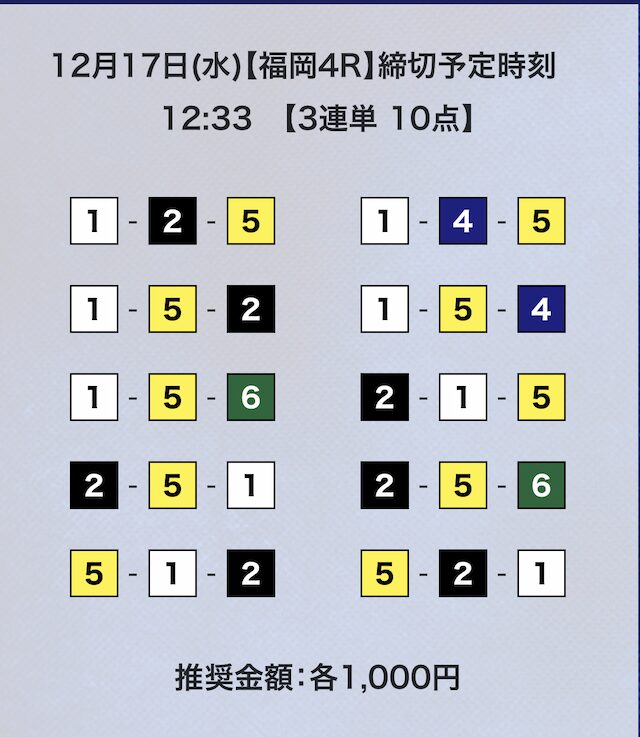 - 12月17日 福岡4R【買い目】三連単2-1-514.5倍14,500円 - 10,000円= 4,500円145%