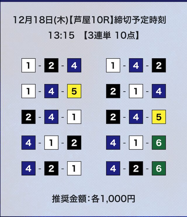 - 12月18日 芦屋10R【買い目】三連単1-3-211.8倍0円 - 10,000円= -10,000円✕