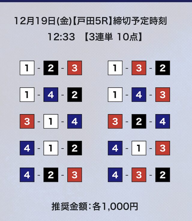 - 12月19日 戸田5R【買い目】三連単3-1-419.9倍19,900円 - 10,000円= 9,900円199%