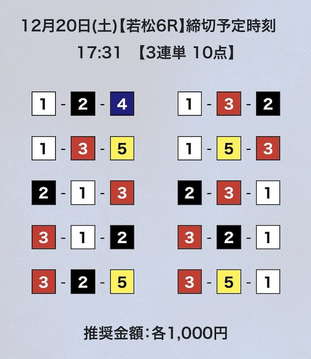 - 12月6日 若松6R【買い目】三連単3-5-1305.5倍305,500円 - 10,000円= 295,500円3,055%