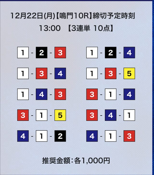 - 12月22日 鳴門10R【買い目】三連単1-3-421.5倍21,500円 - 10,000円= 11,500円215%