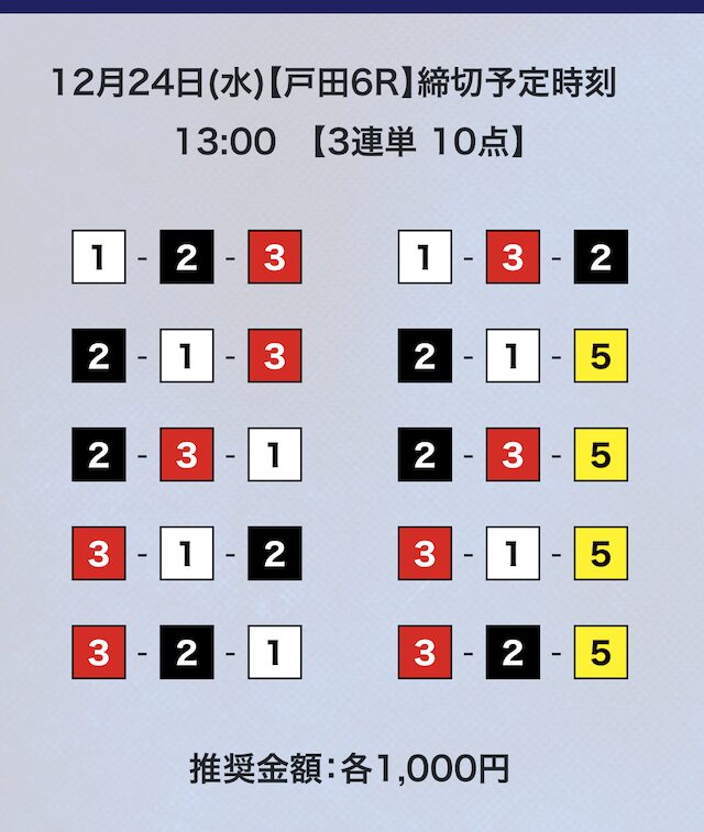 - 12月24日 戸田6R【買い目】三連単1-3-214.6倍14,600円 - 10,000円= 4,600円146%