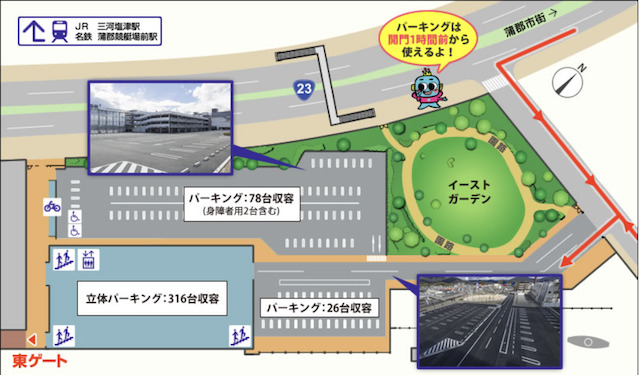 蒲郡競艇場に近い位置にある東立体駐車場は平場104台、立駐316台が駐車可能です。