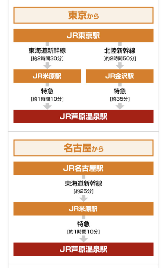 東京駅から向かう方は東海道新幹線で米原駅に向かうか、北陸新幹線で金沢駅に向かいましょう。