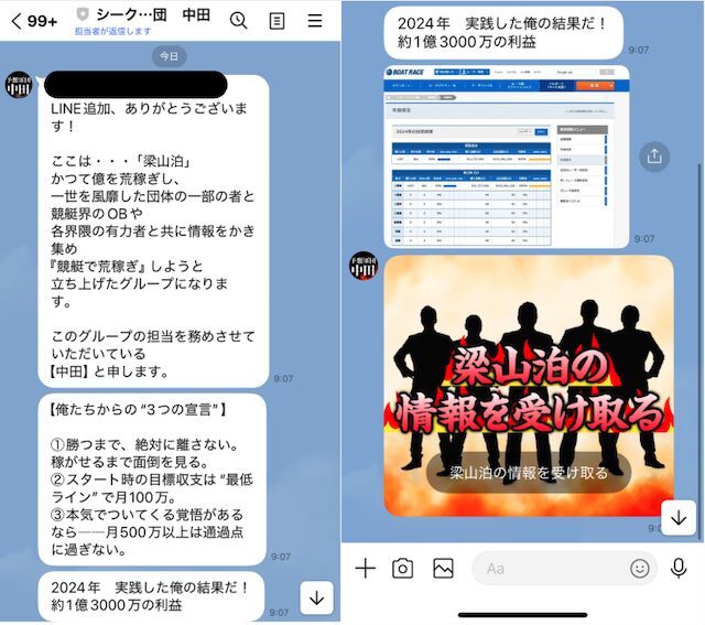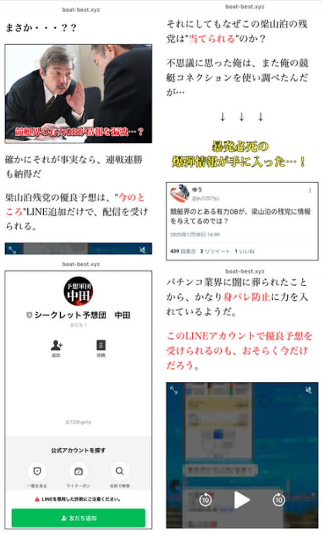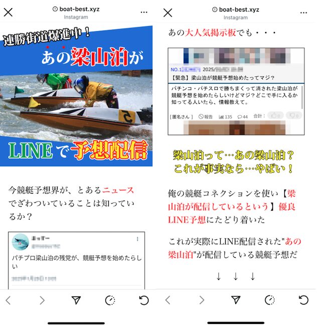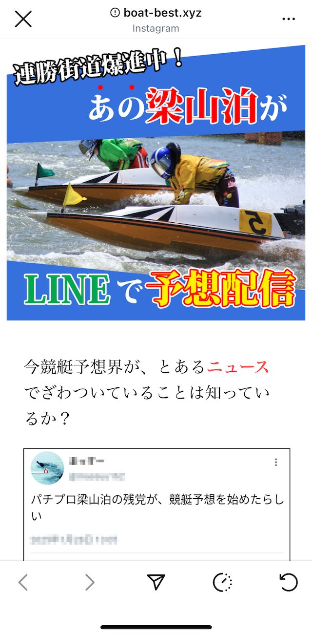 広告内では実際の投稿のように口コミを引用していますが、広告をタップする前に調査したネットやSNSには梁山泊が競艇予想に関わるような情報は一切ない。
