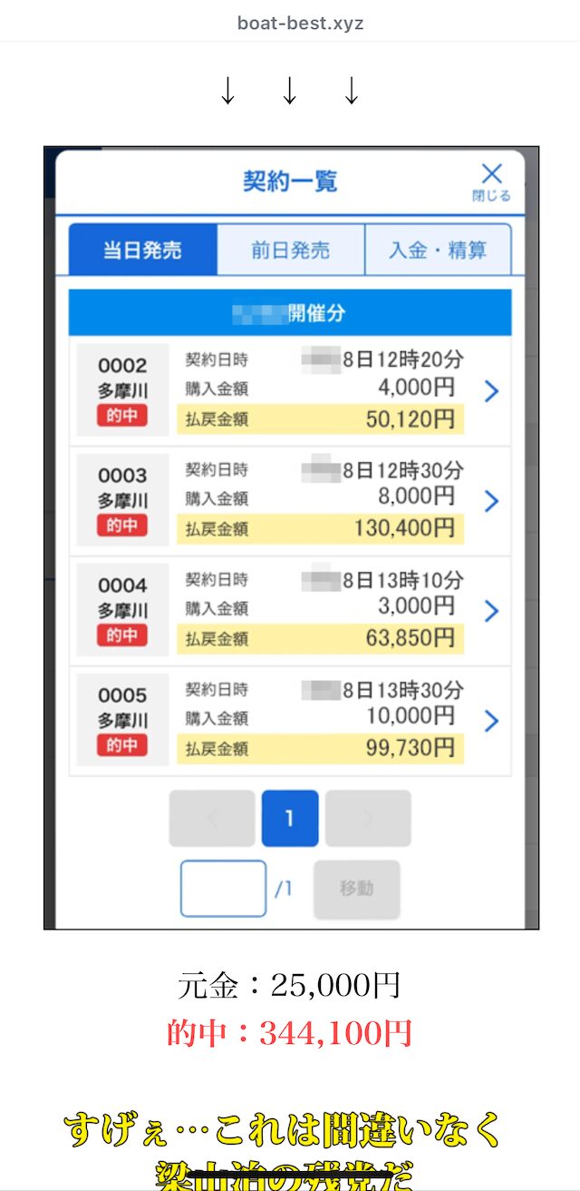 テレボートの的中結果のような画面が掲載されていますが、日付がモザイクで隠されているため実際のレース結果と照らし合わせられません。