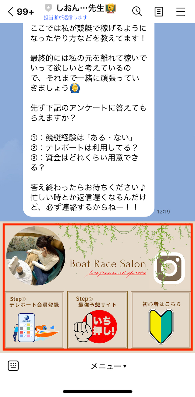実際にリッチメニューをタップしてみた先にあるのが、しおんの競艇投資サロン。
