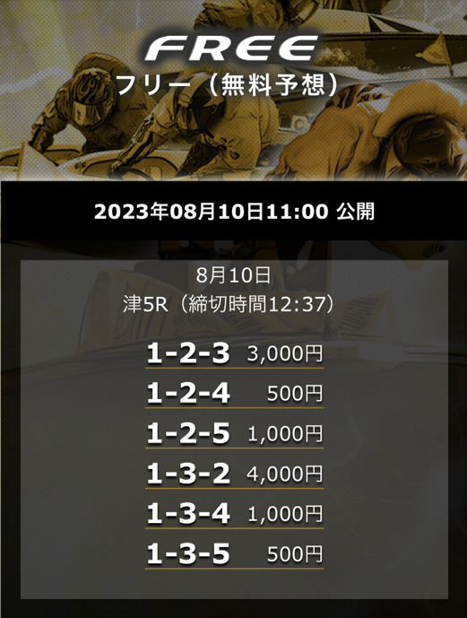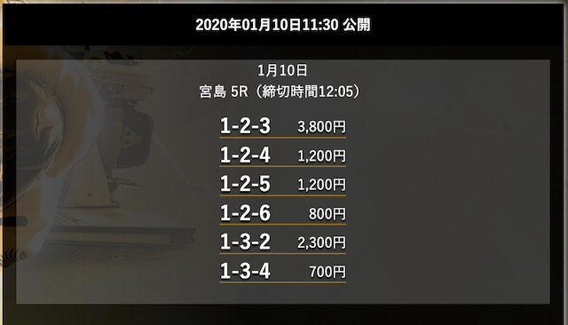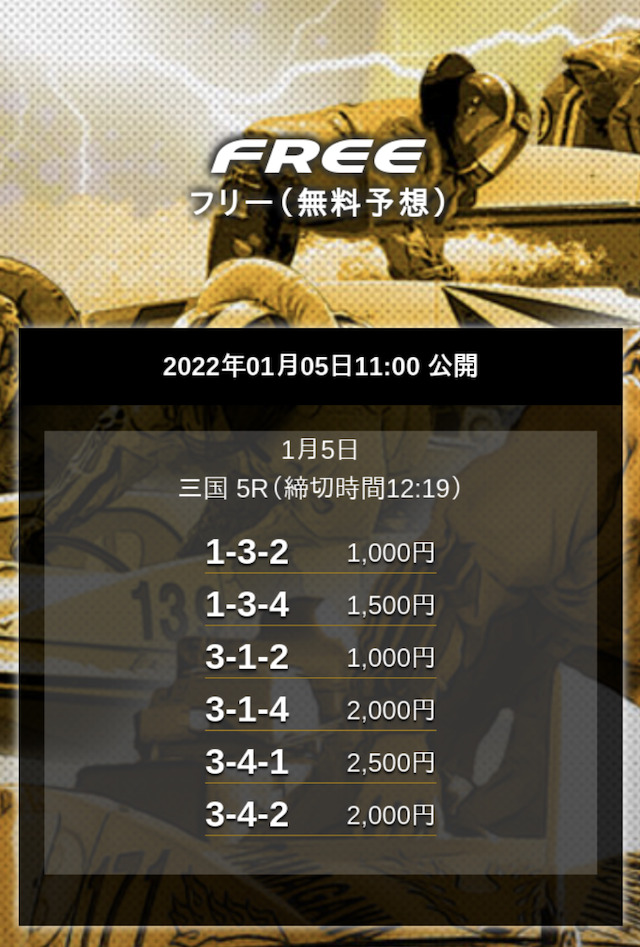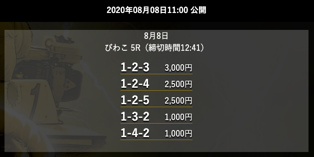 POINTポイント①.本命決着でも数万のプラスを出せる!ポイント②.一撃で帯まで見える有料予想!ポイント③.7点予想で連勝できる展開予想力!- コロ助昨日の無料が宮島で6万1200円の払い戻し出してくれて 今日11月27日は昼の無料が浜名湖で6万7200円、夜は蒲郡で31万5200円も無料情報が当ててくれた