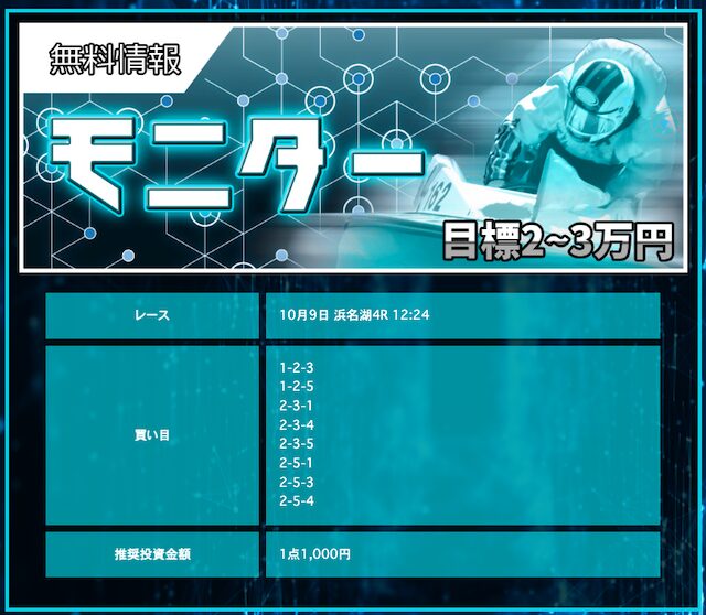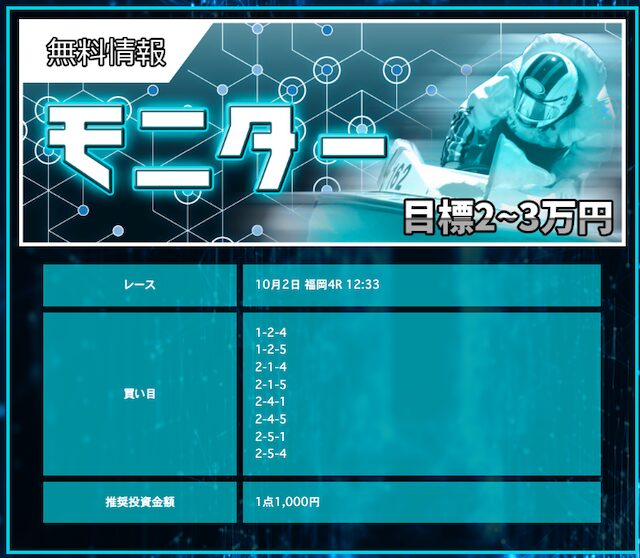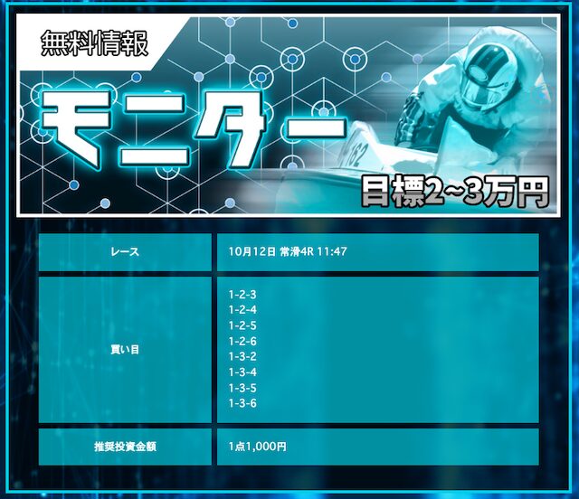 POINTポイント①.一撃で6万円を超える払戻金を獲得!ポイント②.6連勝も実現させる予想の精度!ポイント③.登録は無料&1万円分のポイントが貰える!- 匿名的中率が良いサイトも回収率が良いサイトってどっちかのイメージあるけど、一騎当船はどっちも良いんだよな。 これが本物の予想サイトなんだと思う。 前につかった時は舟券の4倍は稼いでたぞw