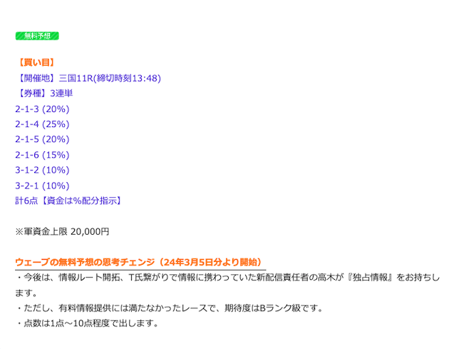 他の方も言っていますが無料予想は下手に冒険せず鉄板を狙っているので、人によっては物足りないと感じるでしょう。