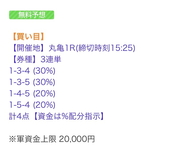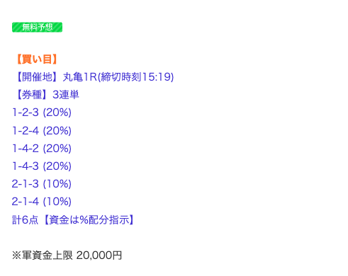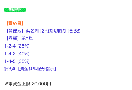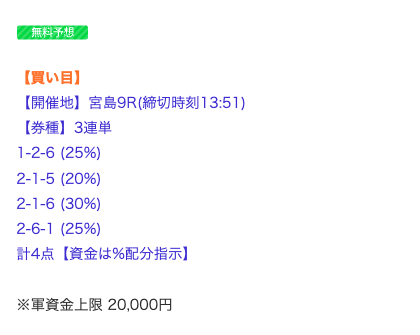 的中率は高いがせっかく勝負しても数百円の利益にしかならない日もある。掛け金を上げられる人じゃないと満足のいく結果は出ない。無料予想だから仕方ない部分はあるが・・・