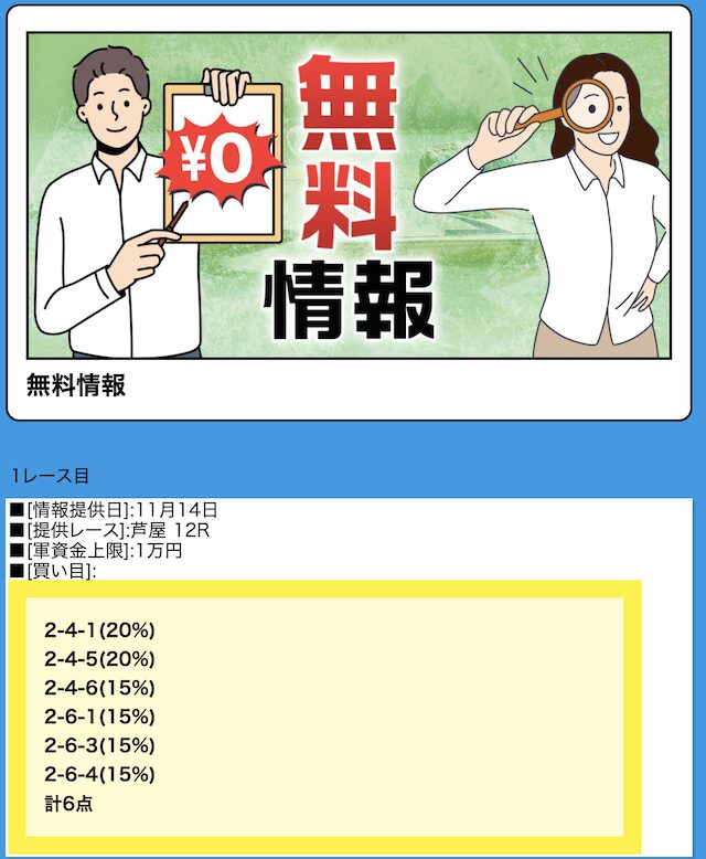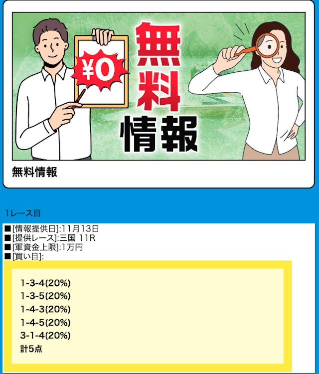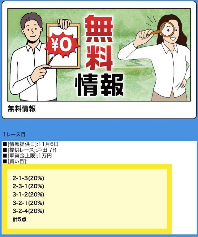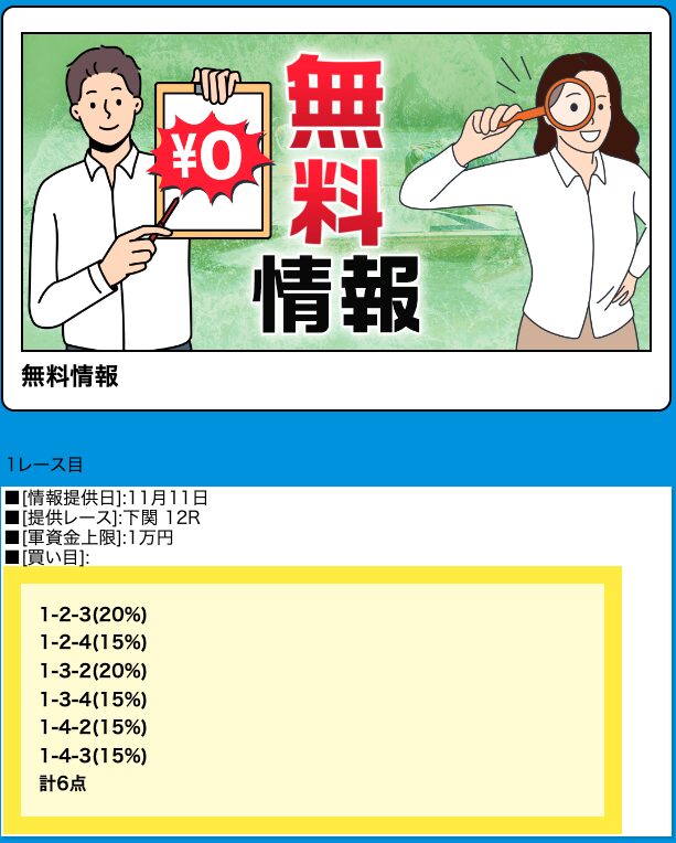 | ・連勝で稼げてる! ・一撃で5万円w これが無料はやばい ・チープなサイト っておもったけど 予想の実力は完璧に近い ・今のところ 8万円プラス! |