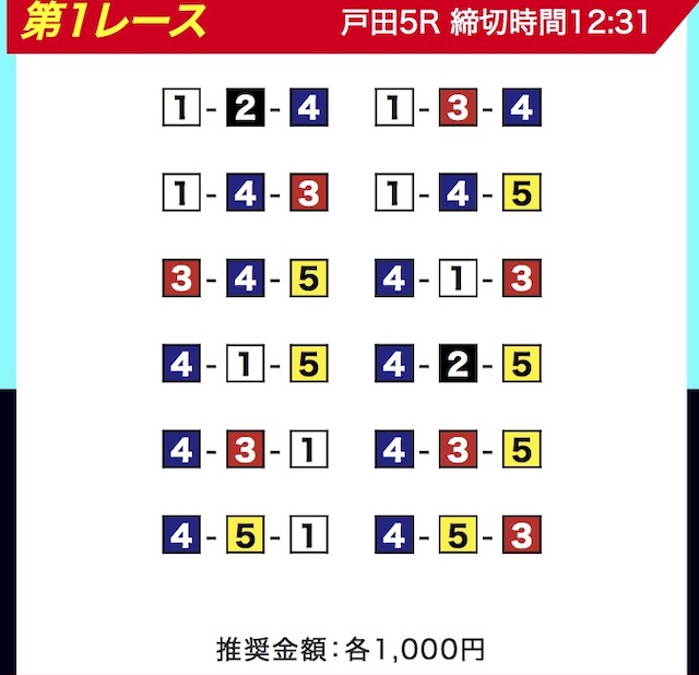 - 11月24日 戸田5R【買い目】三連単4-3-125.2倍25,200円 - 12,000円= 13,200円210%