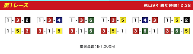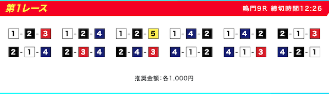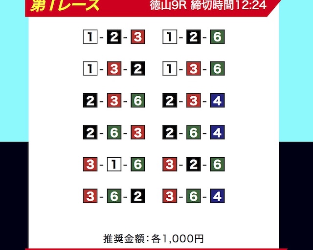 - 11月27日 徳山9R【買い目】三連単1-2-670倍0円 - 12,000円= -12,000円✕