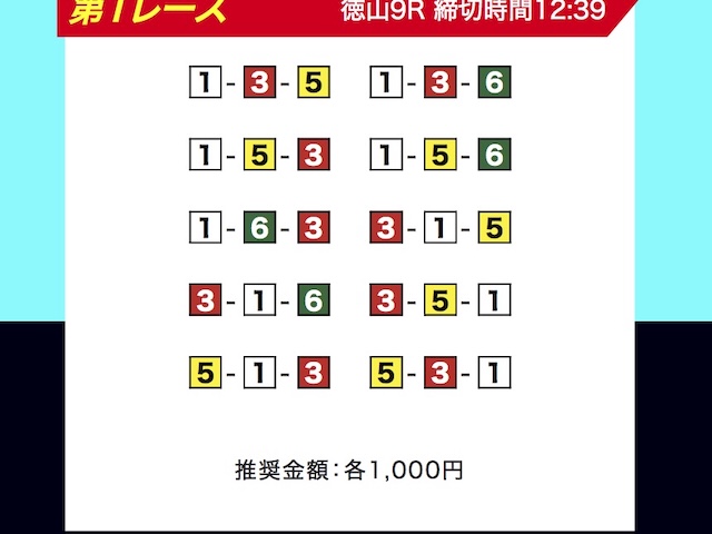 - 12月6日 徳山9R【買い目】三連単3-6-223.7倍23,700円 - 12,000円= 11,700円197.5%