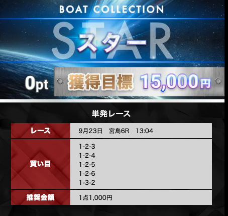 - 9月28日 宮島6R【買い目】三連単1-3-223.5倍23,500円 - 5,000円= 18,500円470%