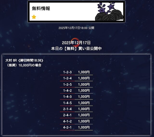 - 匿名6点構成でこれだけ仕上げてくるのはなかなかないと思う。 買い目に無駄がない感じがして、毎回「狙いどころが見えてるな」と思わされる。無理に荒らさず、でも避けるべき穴はちゃんと入ってる。
