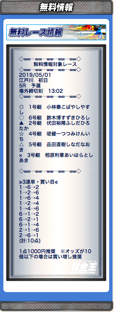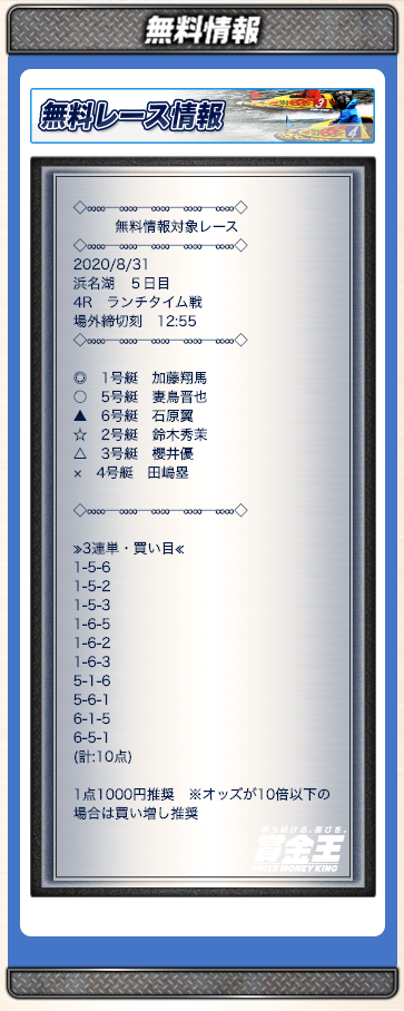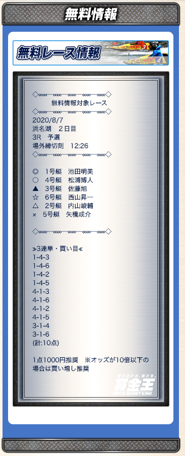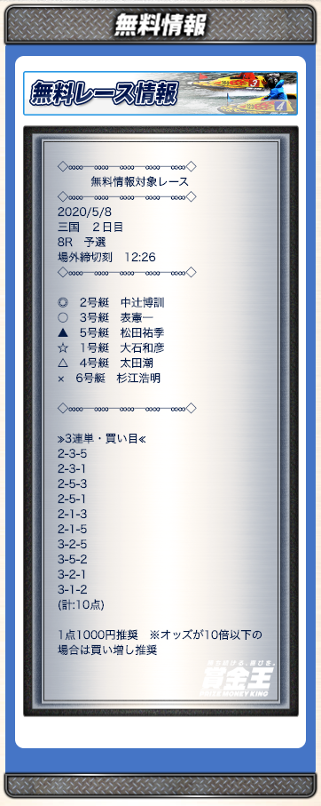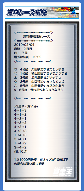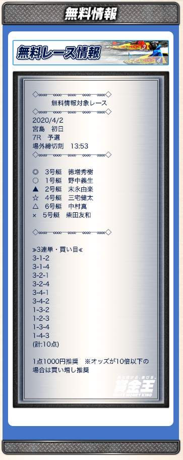検証日に賞金王が公開した無料予想の買い目がこちら。