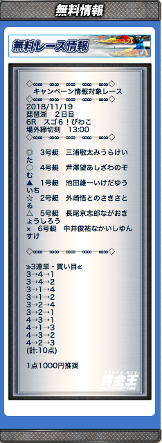 POINTポイント①.本命決着でも数万のプラスを出せる!ポイント②.一撃で帯まで見える有料予想!ポイント③.7点予想で連勝できる展開予想力!- コロ助昨日の無料が宮島で6万1200円の払い戻し出してくれて 今日11月27日は昼の無料が浜名湖で6万7200円、夜は蒲郡で31万5200円も無料情報が当ててくれた