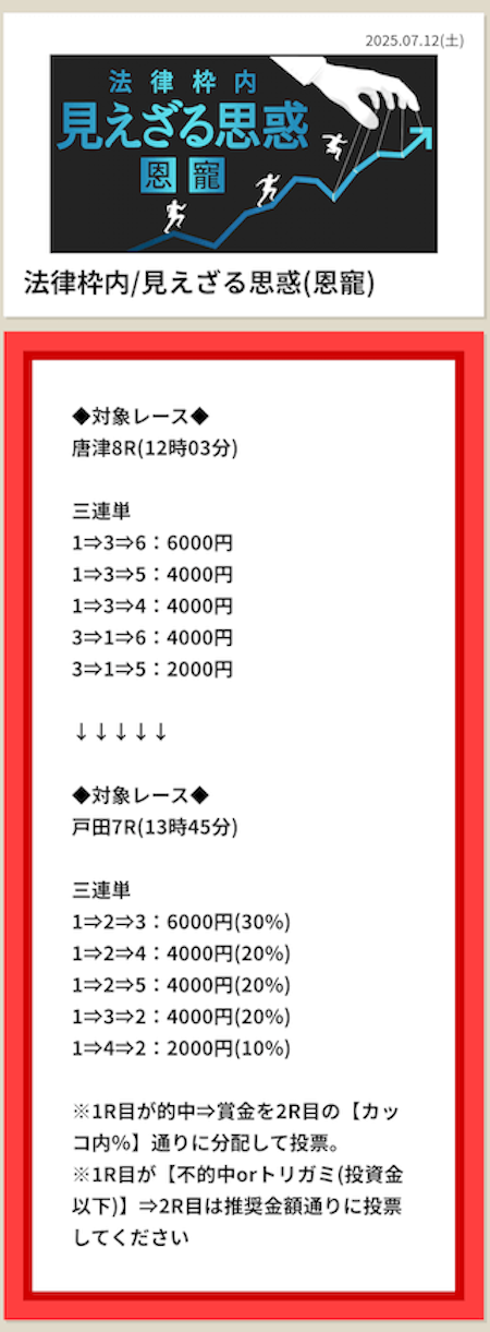 絶妙なヒモ抜けや2・3着ズレを突いてくるあたりが上手い。中途半端な予想サイトよりも結果が明確。