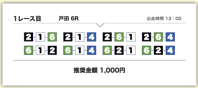 - 11月7日 戸田6R【買い目】三連単2-1-612.7倍12,700円 - 8,000円= 4,700円158.8%