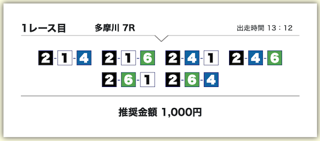 - 11月11日 多摩川7R【買い目】三連単1-2-617倍0円 - 6,000円= -6,000円✕