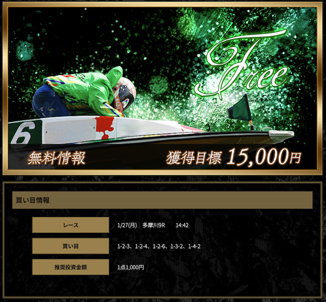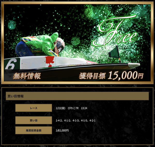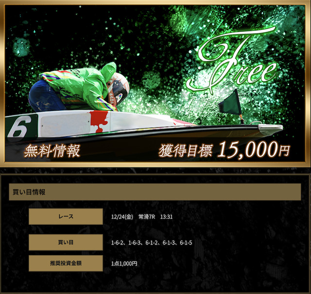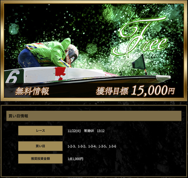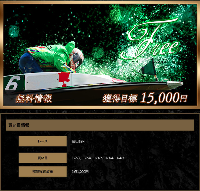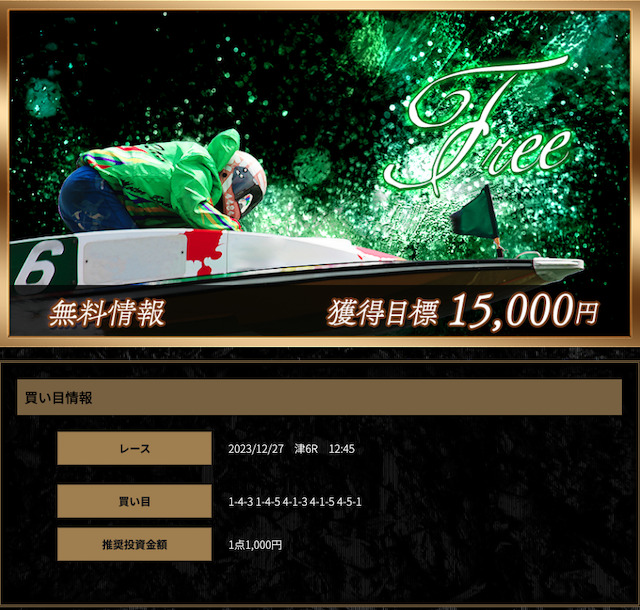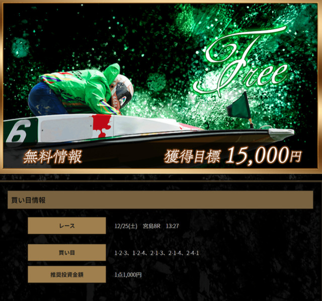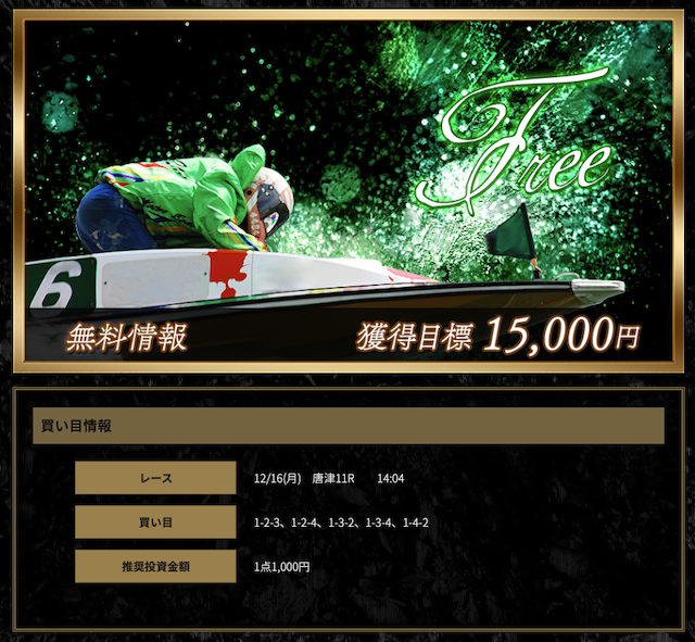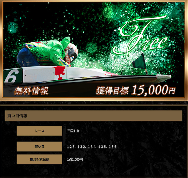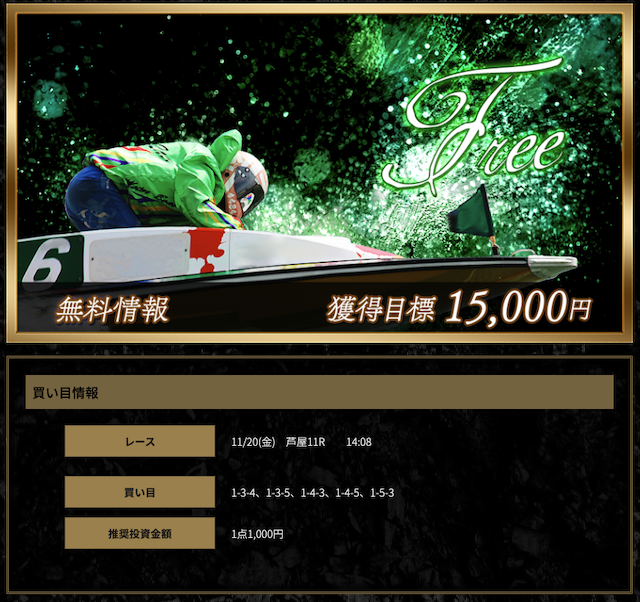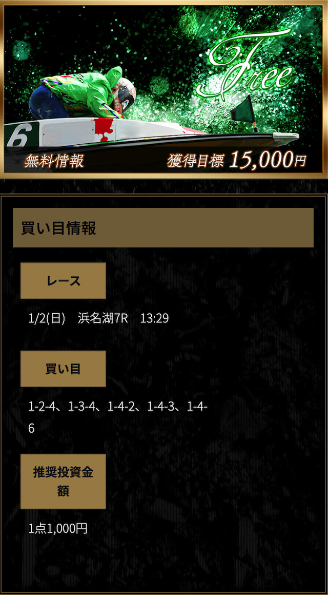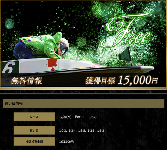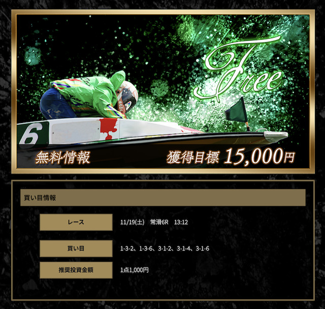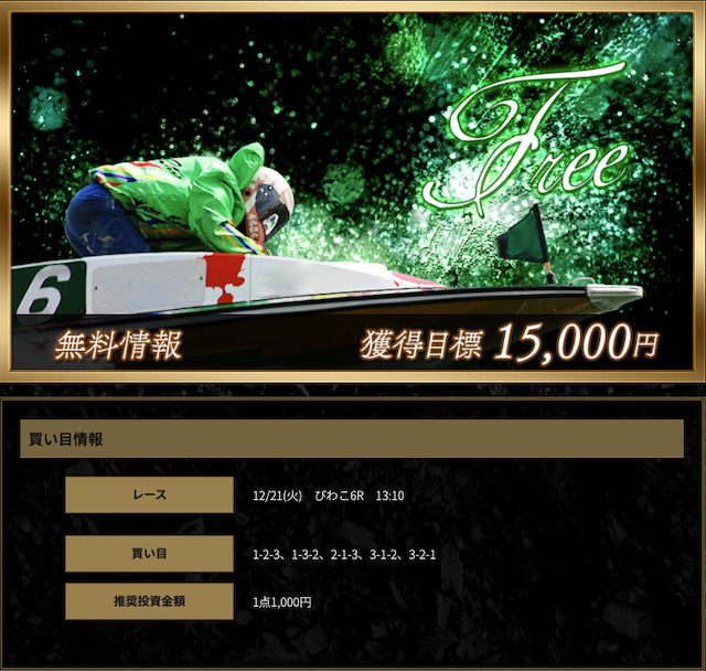 POINTポイント①.本命決着でも数万のプラスを出せる!ポイント②.一撃で帯まで見える有料予想!ポイント③.7点予想で連勝できる展開予想力!- コロ助昨日の無料が宮島で6万1200円の払い戻し出してくれて 今日11月27日は昼の無料が浜名湖で6万7200円、夜は蒲郡で31万5200円も無料情報が当ててくれた