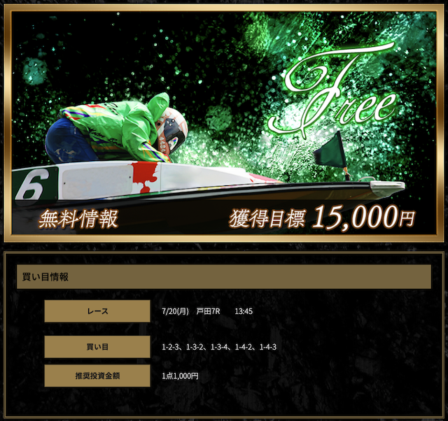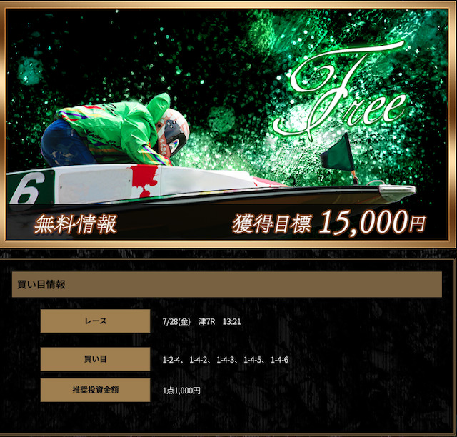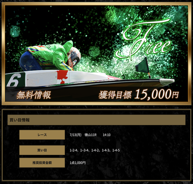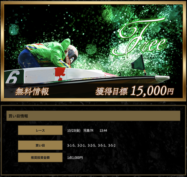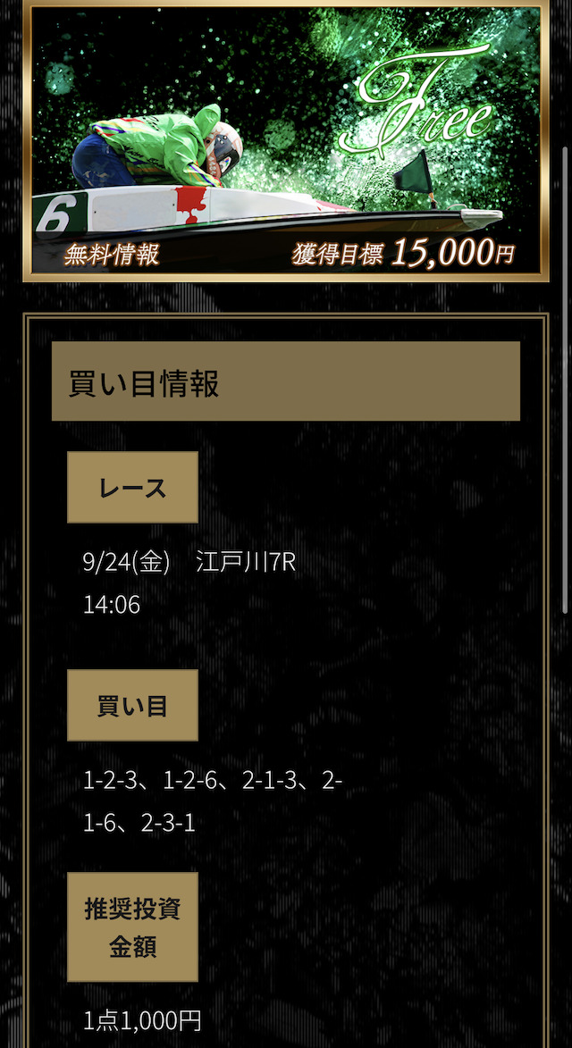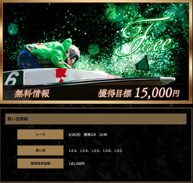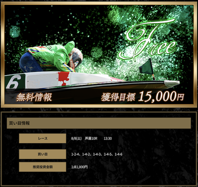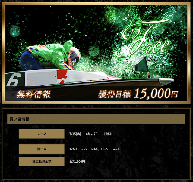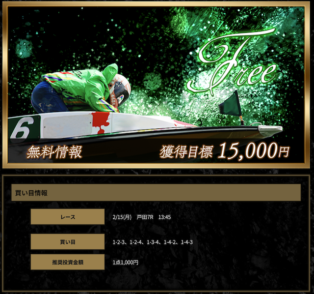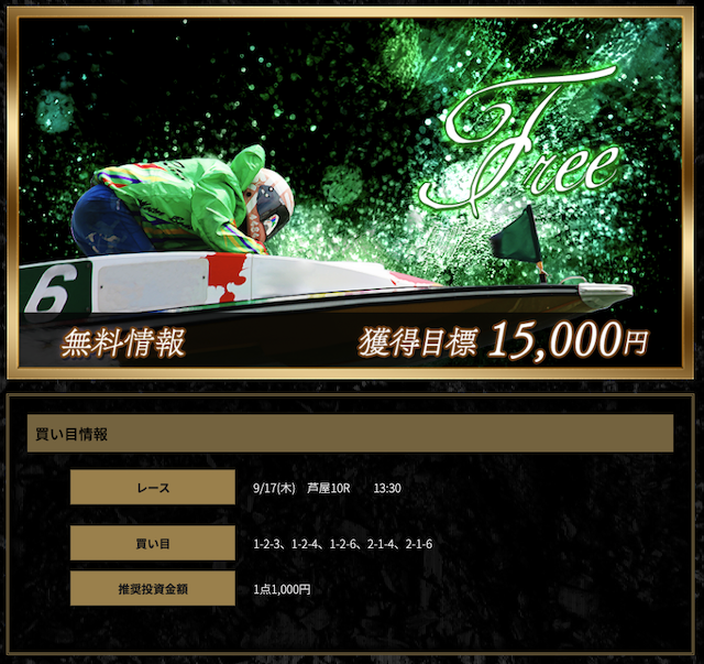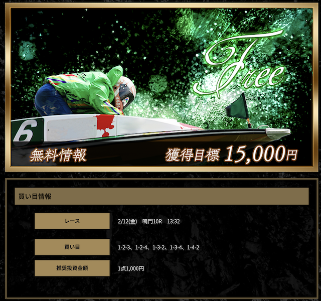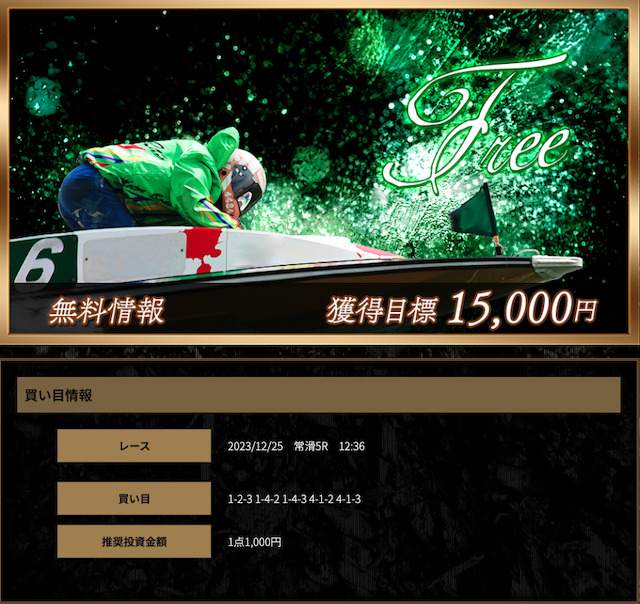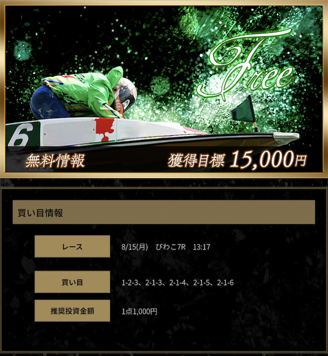 POINTポイント①.本命決着でも数万のプラスを出せる!ポイント②.一撃で帯まで見える有料予想!ポイント③.7点予想で連勝できる展開予想力!- コロ助昨日の無料が宮島で6万1200円の払い戻し出してくれて 今日11月27日は昼の無料が浜名湖で6万7200円、夜は蒲郡で31万5200円も無料情報が当ててくれた
