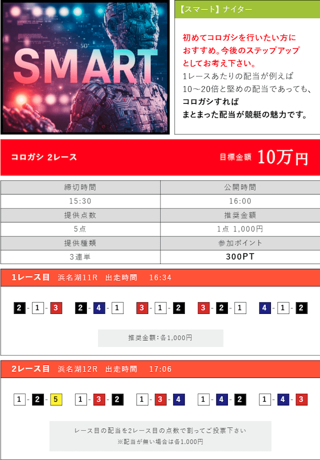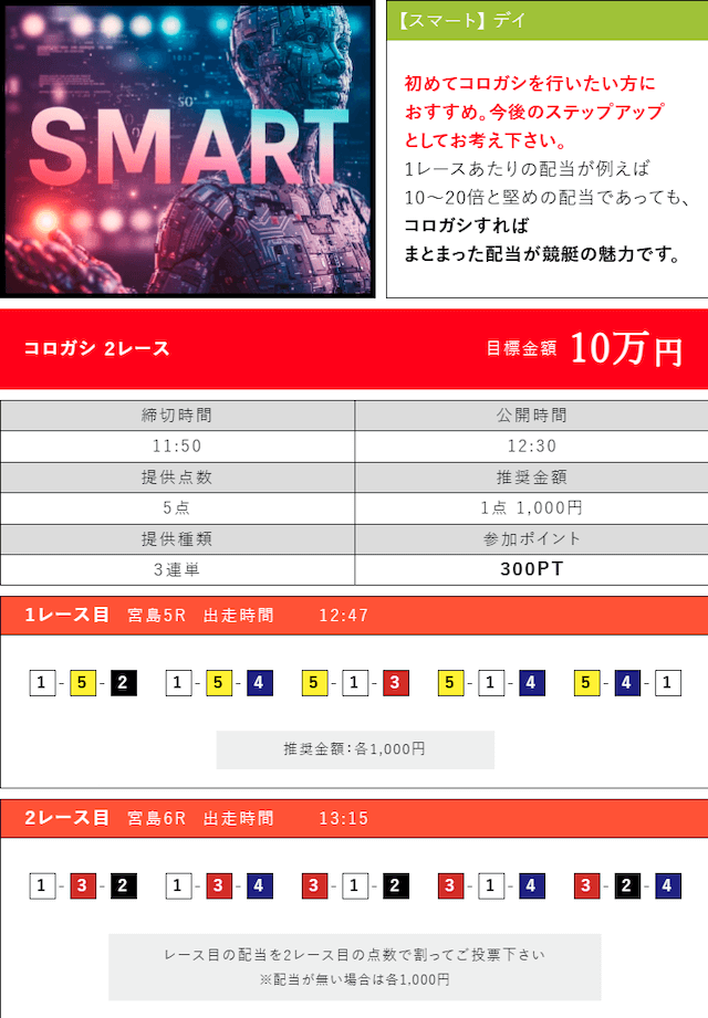 基本穴狙いしかしないんですが、まじで当たらないんでAIってことで使ってみました。予想サイトに丸乗りはちょっといやだったんで最初見てただけですが、3連勝してましたw買えば良かった・・・。その後は丸乗りして4連勝してます!一撃ドカンって感じではないですけど、自分の負け分取り返せるのはほんとありがたい!