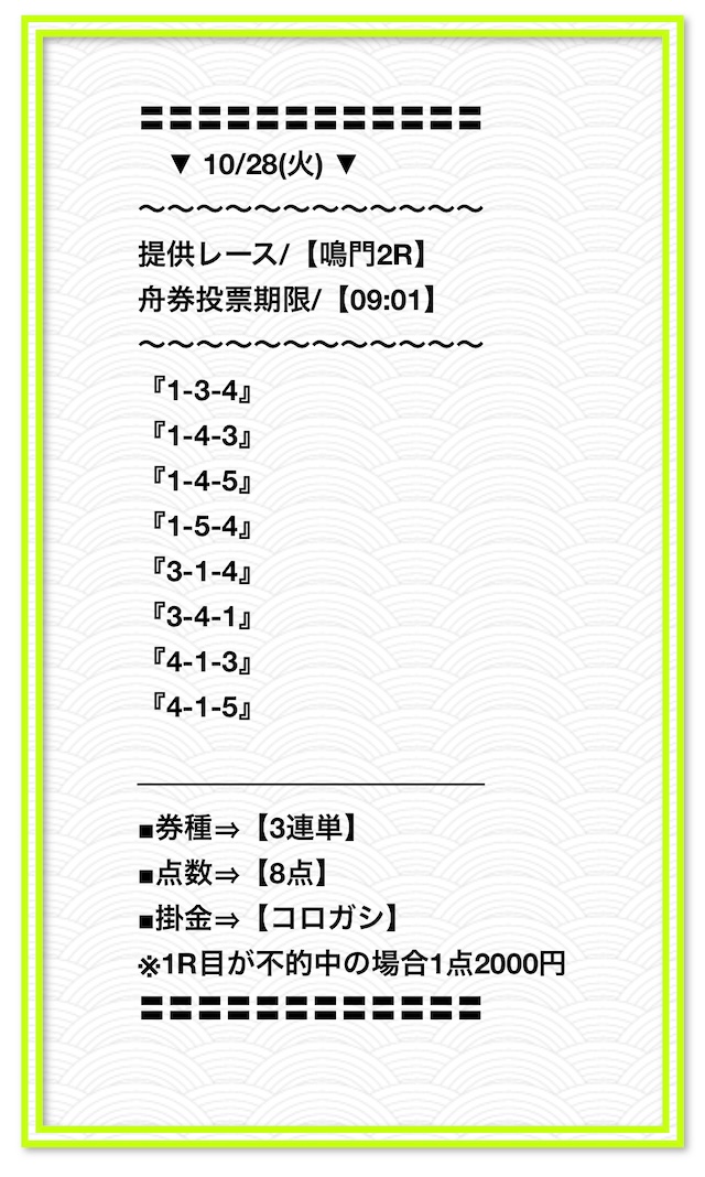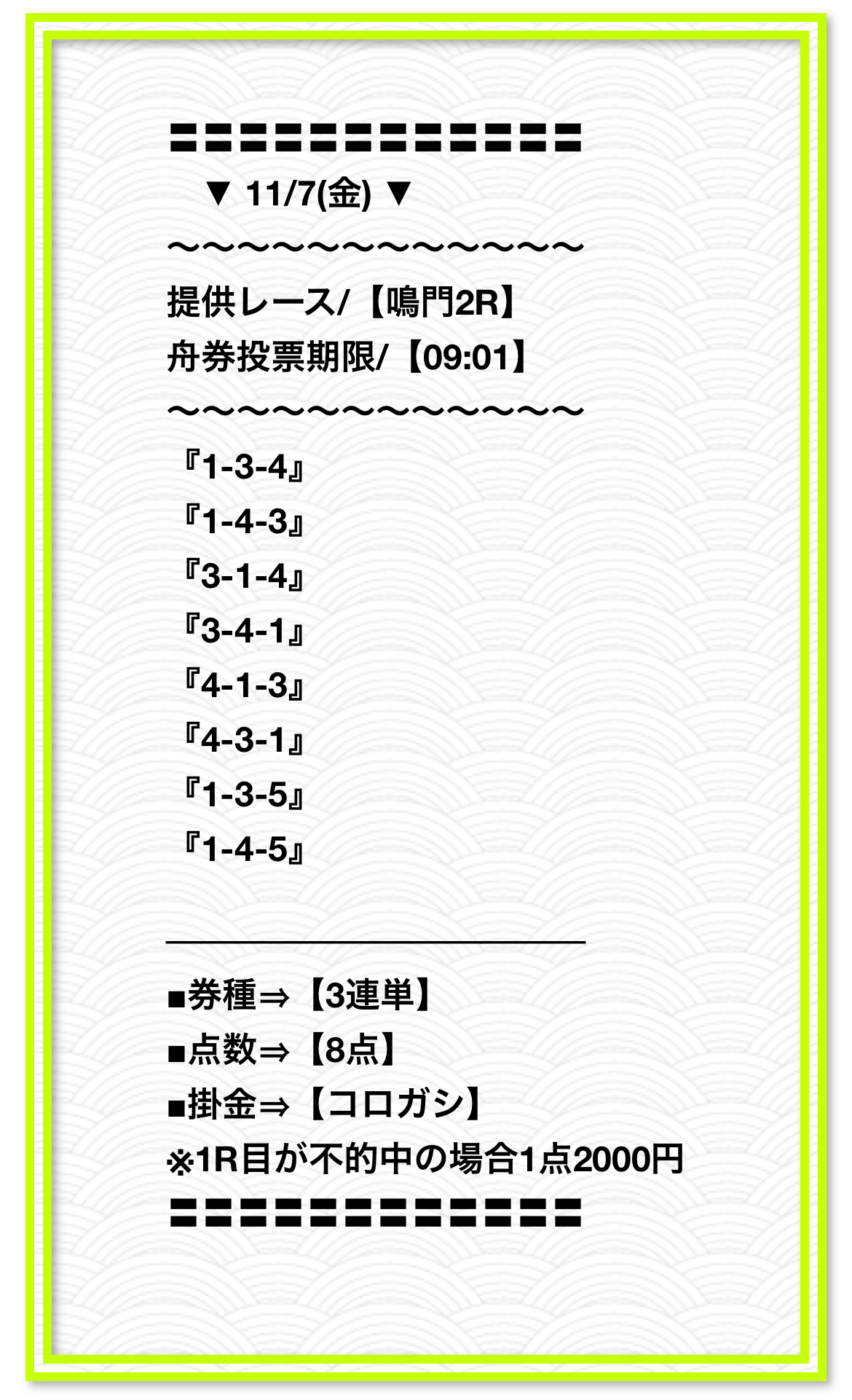 - 11月7日 鳴門2R【買い目】三連単2-1-343倍0円 - 4,000円= -4,000円✕