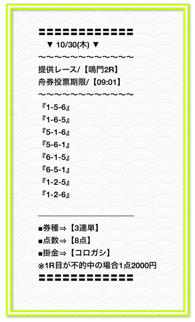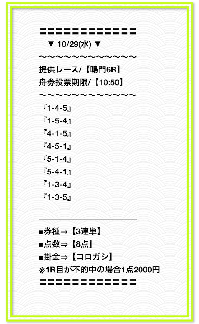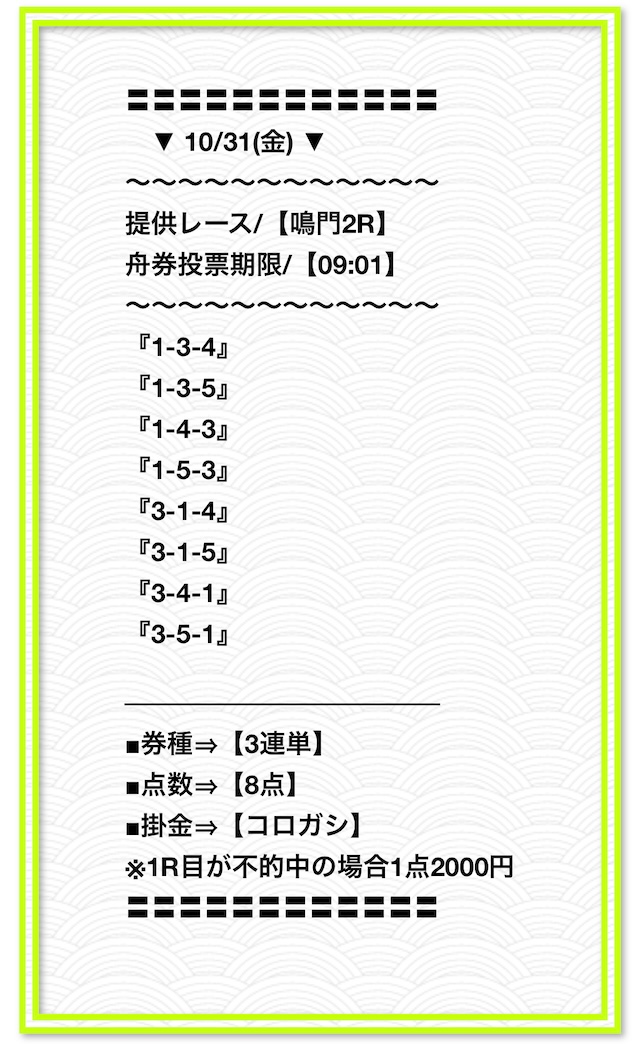 - 10月30日 鳴門2R【買い目】三連単2-1-353.9倍0円 - 4,000円= -4,000円✕