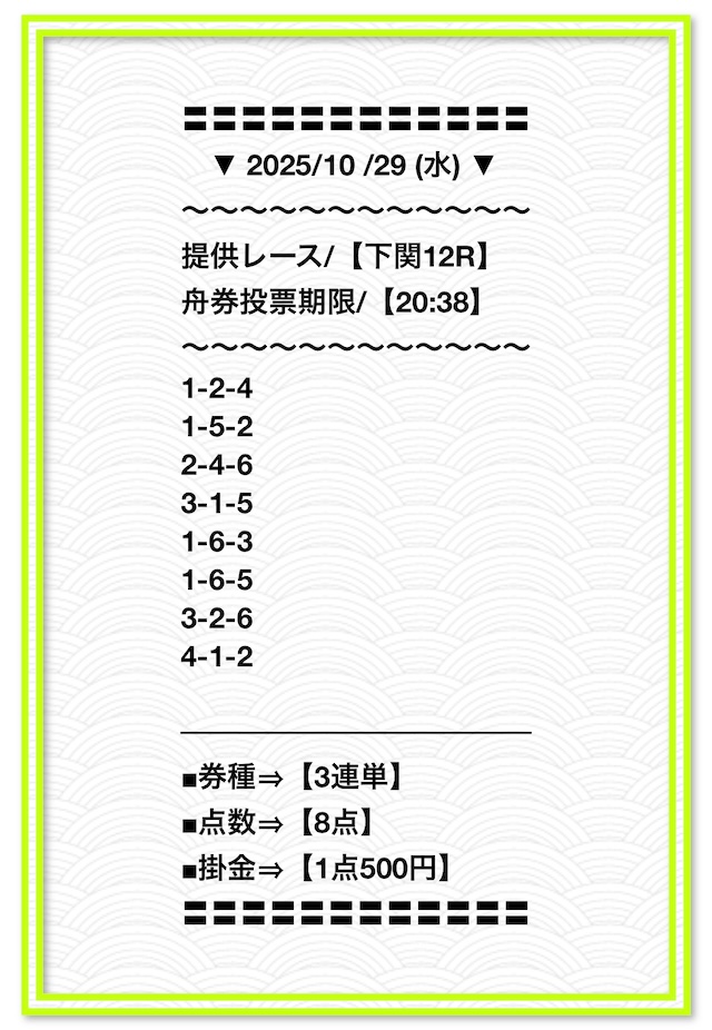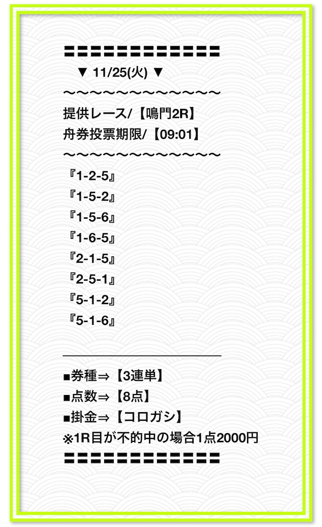 - 11月25日 鳴門2R【買い目】三連単5-1-2133.5倍66,750円 - 4,000円= 62,750円1,669%