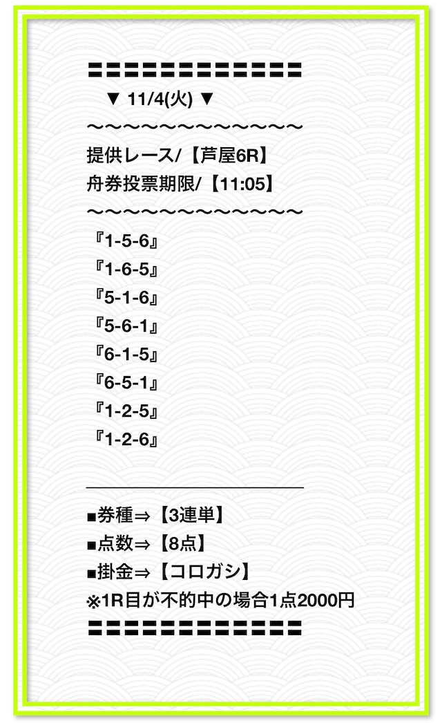 - 11月4日 芦屋6R【買い目】三連単3-4-1445倍0円 - 4,000円= -4,000円✕