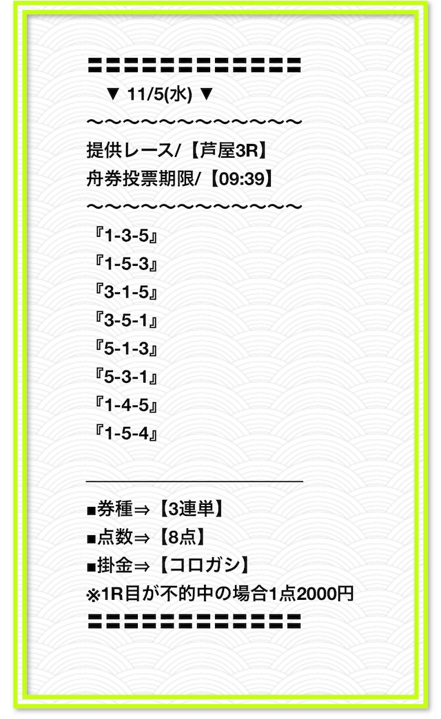 - 11月5日 芦屋3R【買い目】三連単1-5-453.5倍26,750円 - 4,000円= 22,750円668.8%