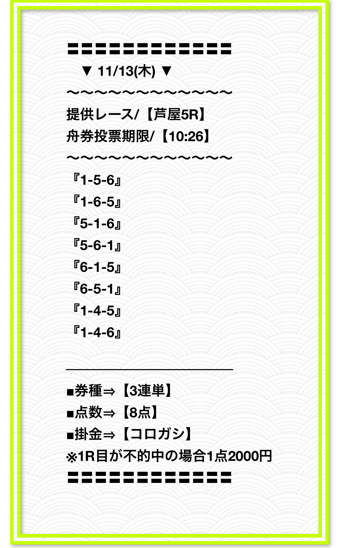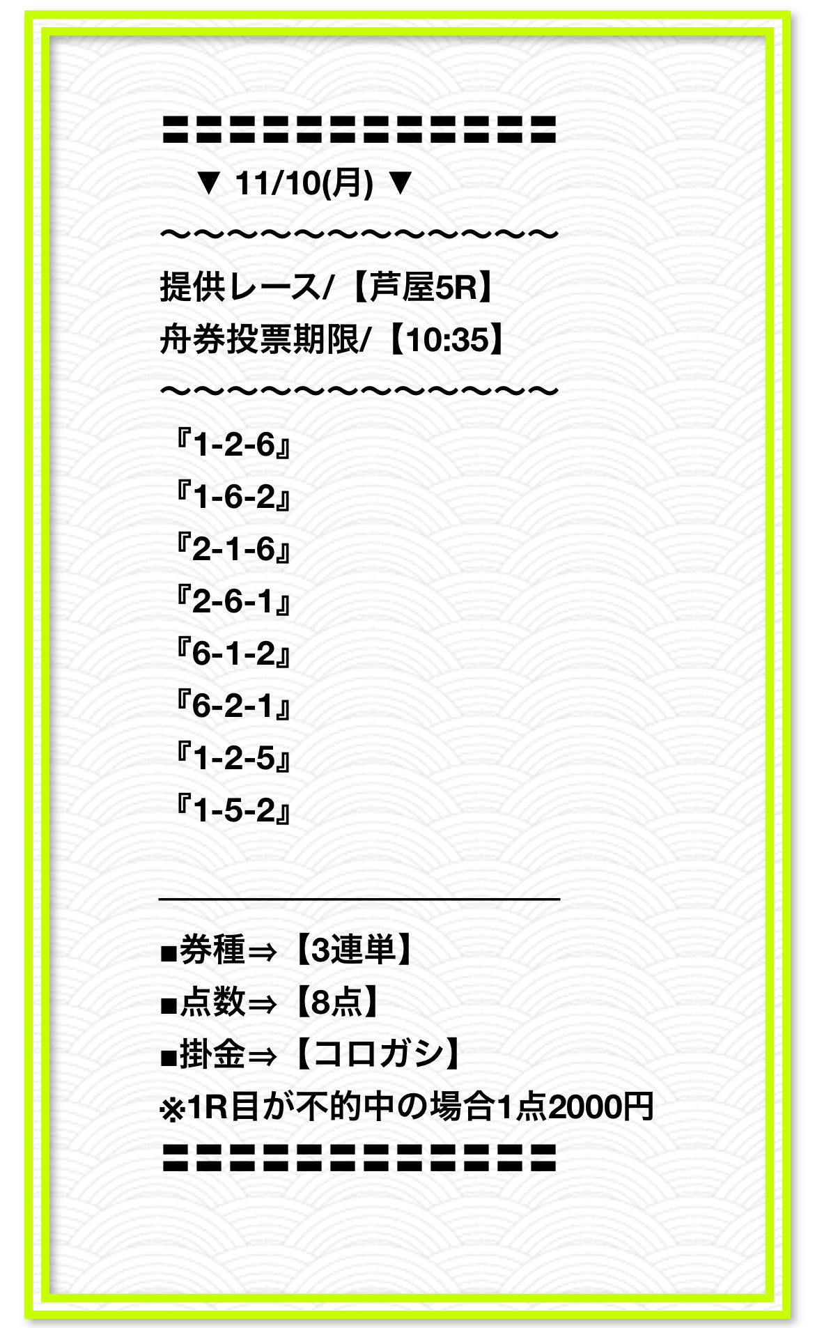 - 11月10日 芦屋5R【買い目】三連単1-3-68.2倍0円 - 4,000円= -4,000円✕