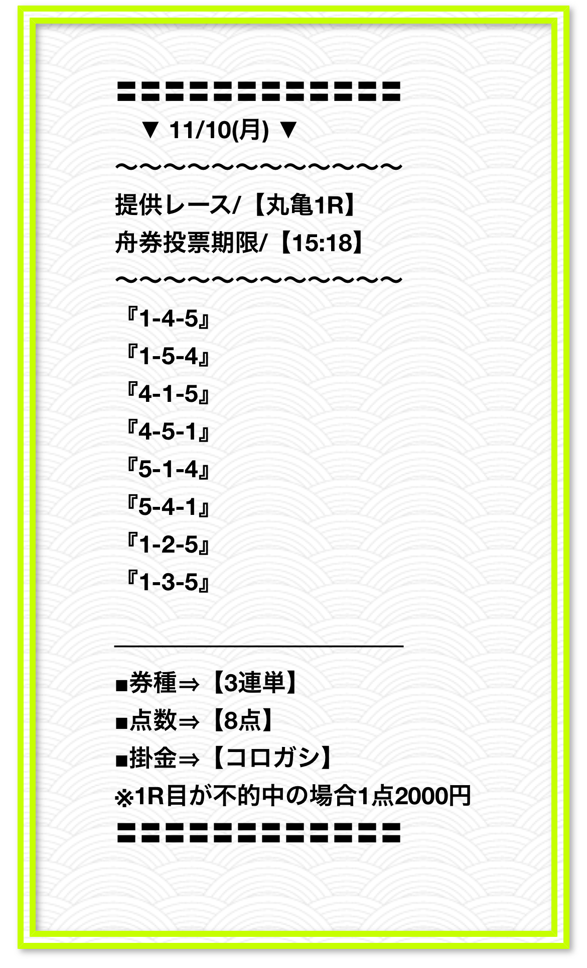 - 11月10日 丸亀1R【買い目】三連単5-2-4103.9倍0円 - 4,000円= -4,000円✕