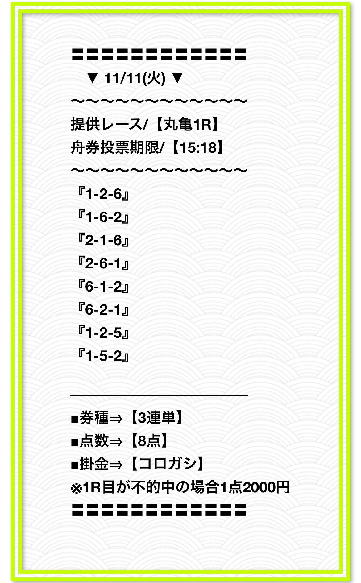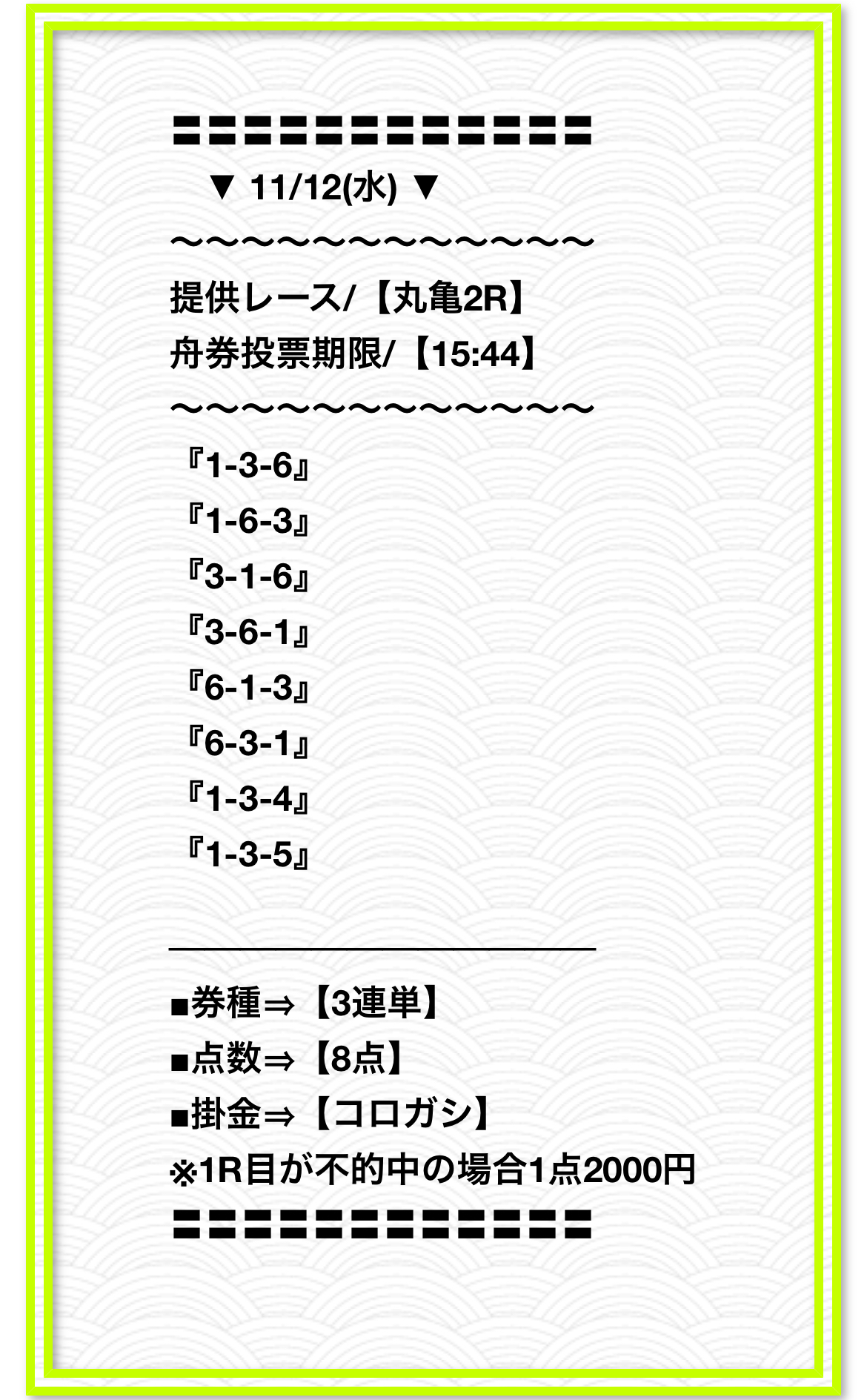- 11月12日 丸亀2R【買い目】三連単3-4-2186.5倍0円 - 4,000円= -4,000円✕