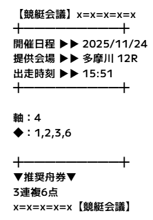 - 11月24日 多摩川12R【買い目】三連複4-3-221.6倍21,600円 - 6,000円= 15,600円360%