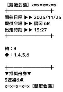 - 11月25日 福岡6R【買い目】三連複4-3-623.5倍23,500円 - 6,000円= 17,500円391.7%