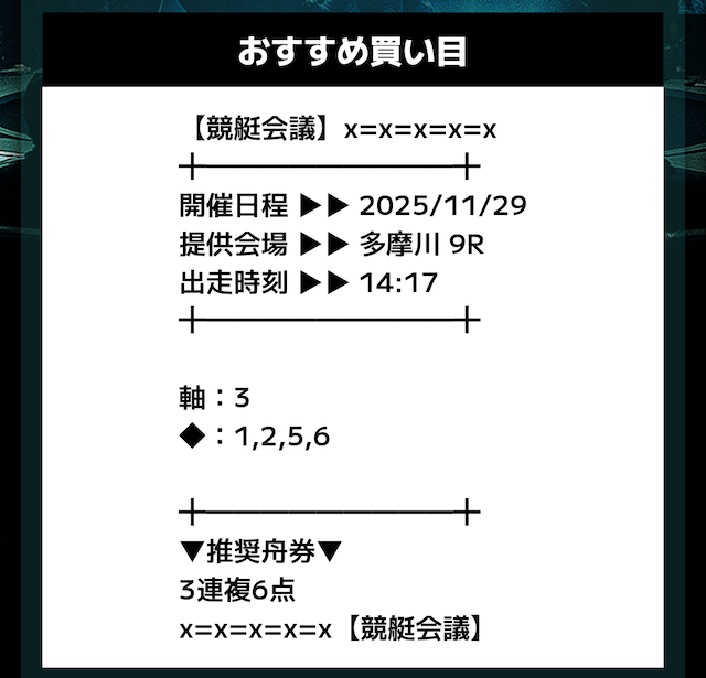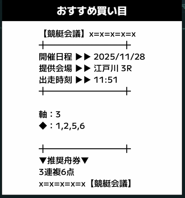 - 11月28日 江戸川3R【買い目】三連複3-4-623.7倍0円 - 6,000円= -6,000円✕